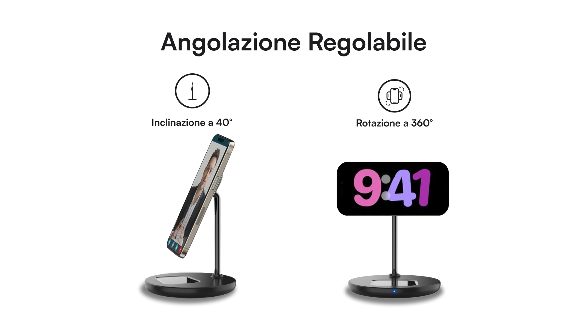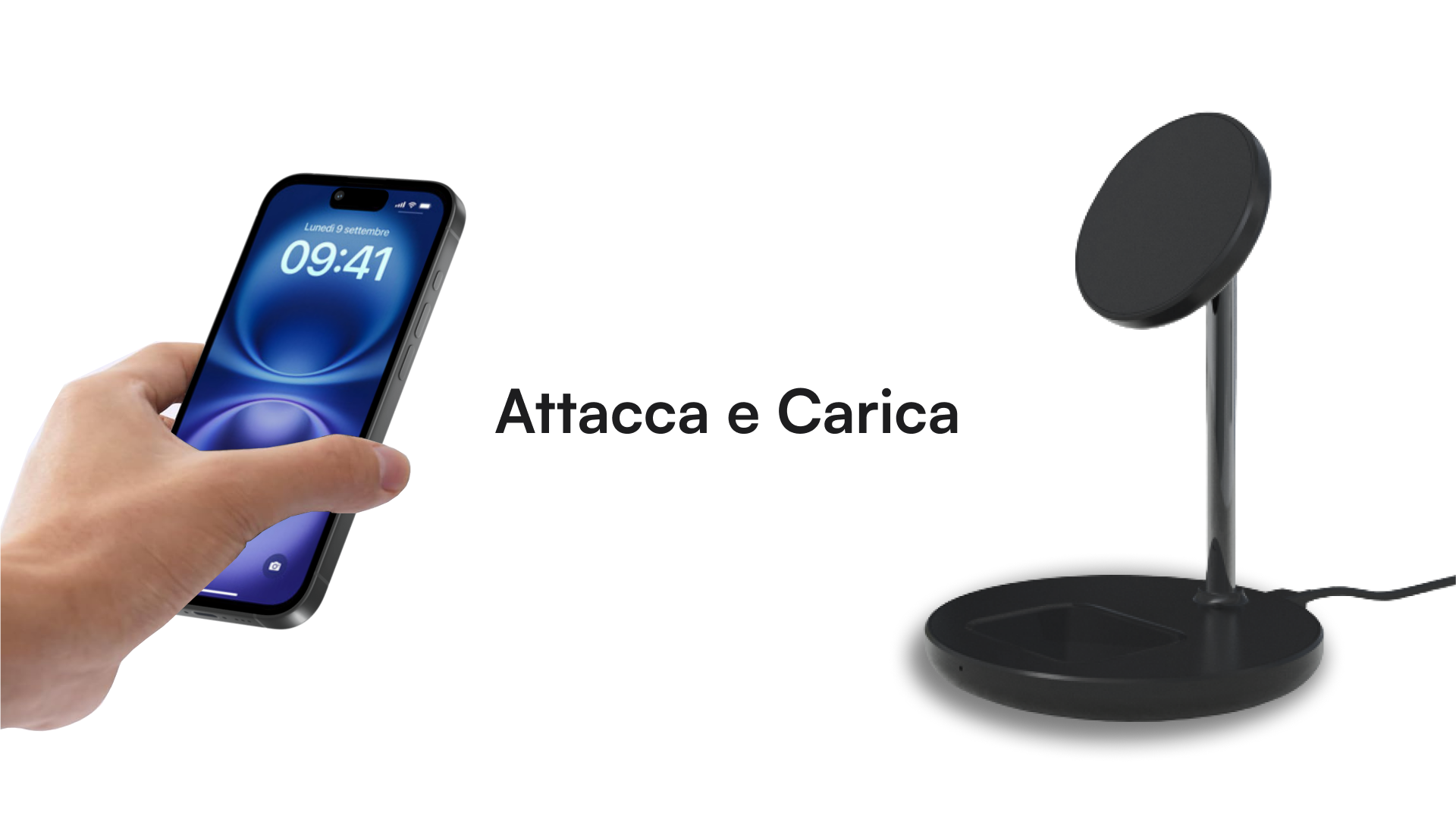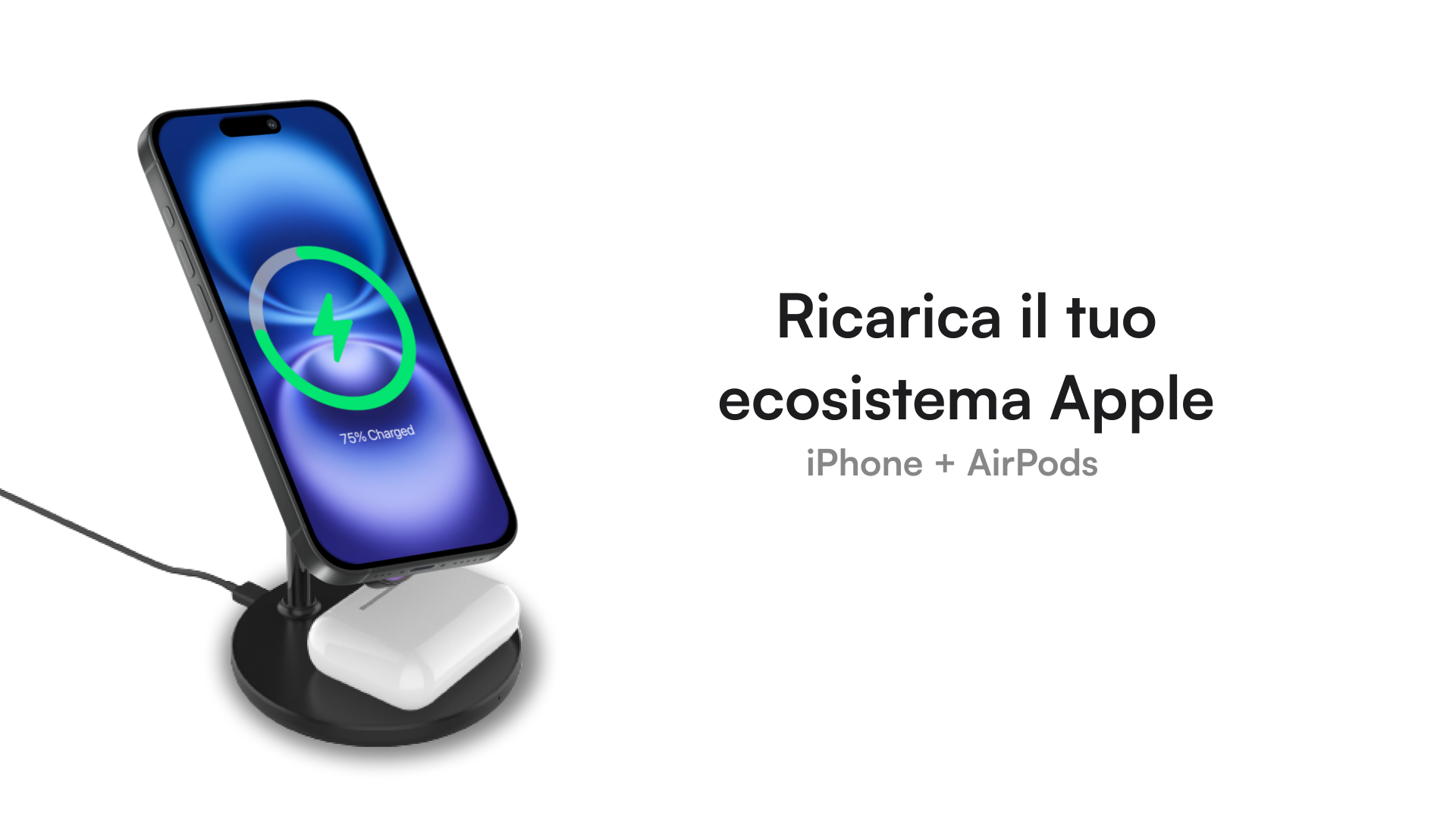 - Il nostro caricatore 2 in 1 MagSafe è l'aggiunta ideale per la tua vita domestica, pensato per garantire la massima comodità durante la notte. Grazie all'aggiornamento a iOS 17, puoi sfruttare la modalità StandBy del tuo iPhone, che lo trasforma in un comodo orologio digitale o assistente notturno.